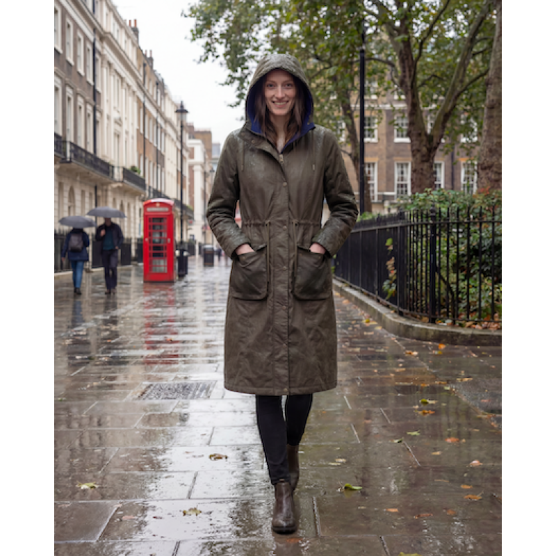 This women's loose fit waxed cotton overcoat offers the best in rain protection and breathability co..